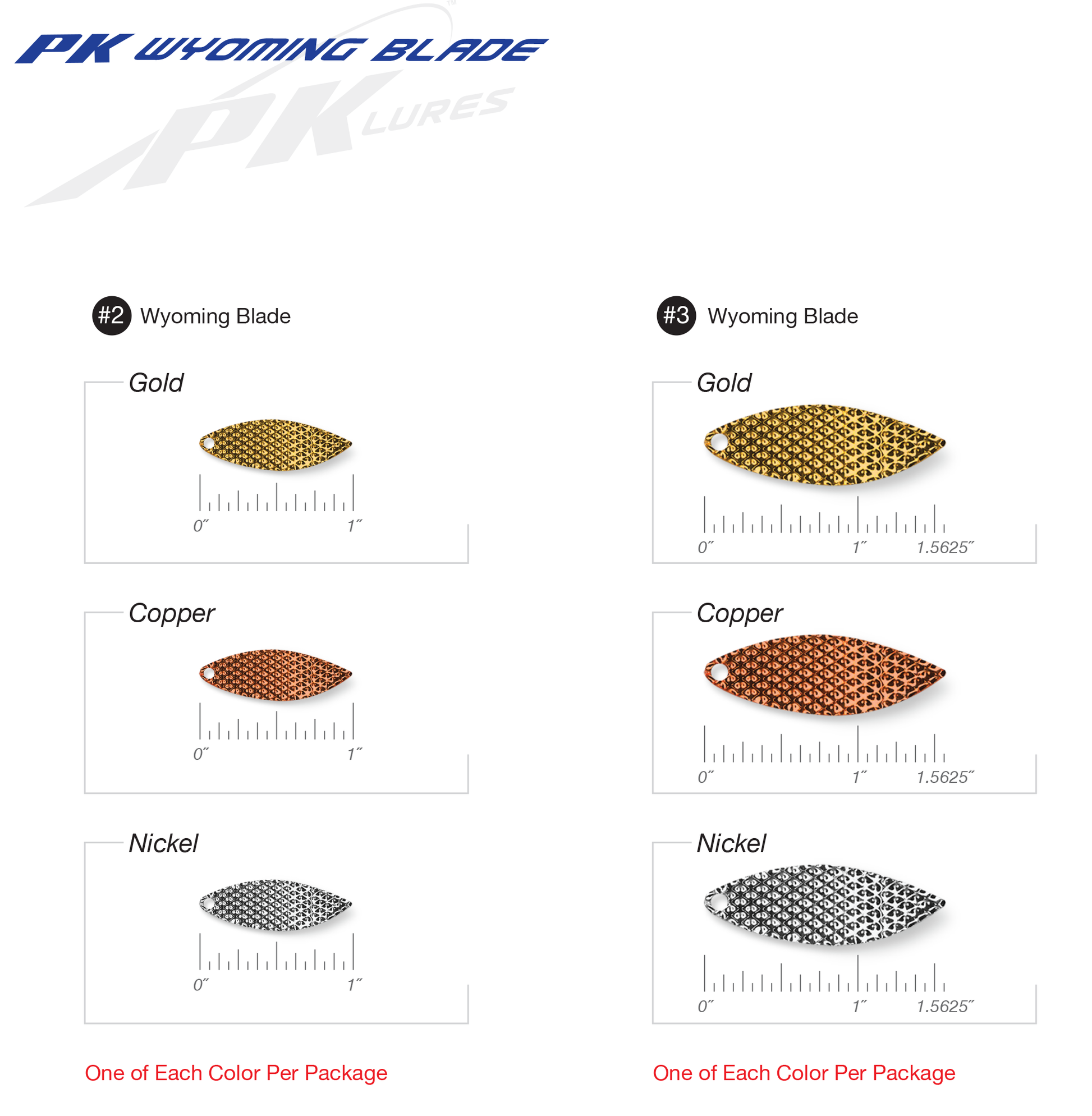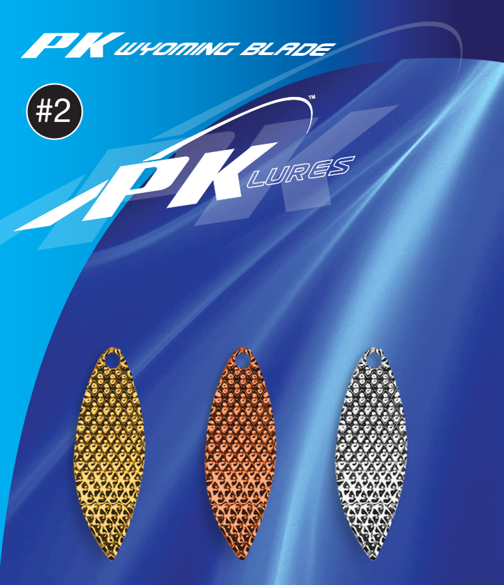 The Patent design blade on our PK Predator is now available in a variety of larger sizes to enhance your current PK Spoon. The PK Wyoming blade can also be used to replace any application where a traditional blade is used on a spoon to enhance flash, action, and vibration. Available in 2 sizes with 3 blades in each pack Nickel, Copper, and Gold blade colors.